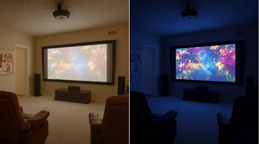 Projectors rely on reflected light, unlike TVs that emit their own light. Strong ambient light (sunlight, ceiling lights, wall reflections) competes with the projected image, causing: